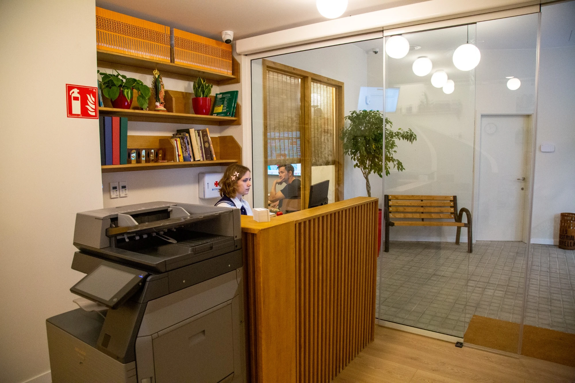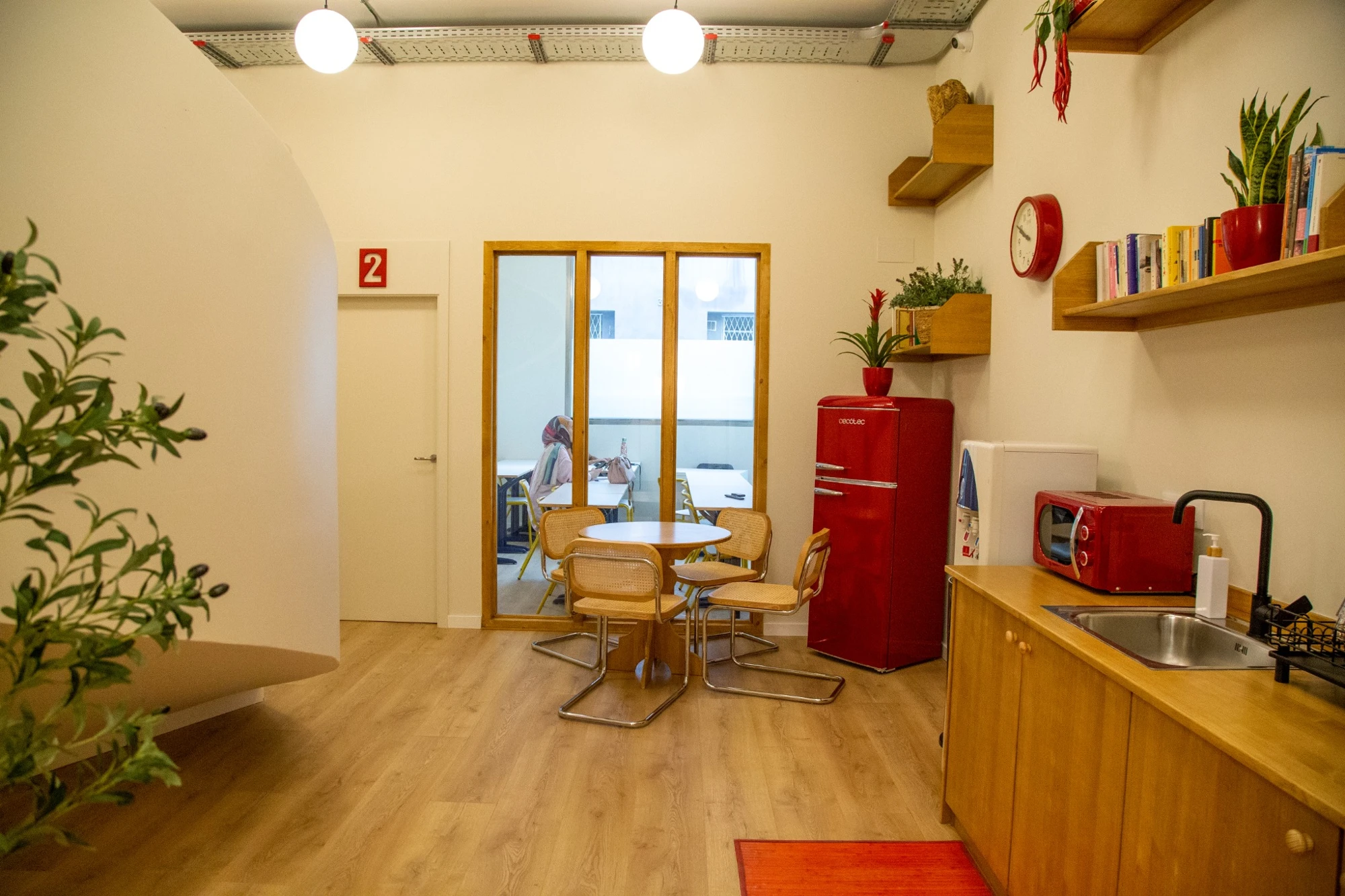 Sala de lectura, servicio de biblioteca, sala de estudio y cafetería. En la cafetería: té, café y galletas gratuitos, máquina de agua y compromiso sostenible.